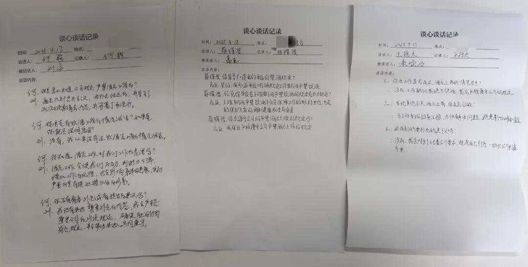 公司各部門組織開展全覆蓋式涉酒等風險隱患排查,通過“一對一”談話、“面對面”提醒等方式,深入排查重點人員、關鍵環節,確保風險隱患無遺漏、無死角。